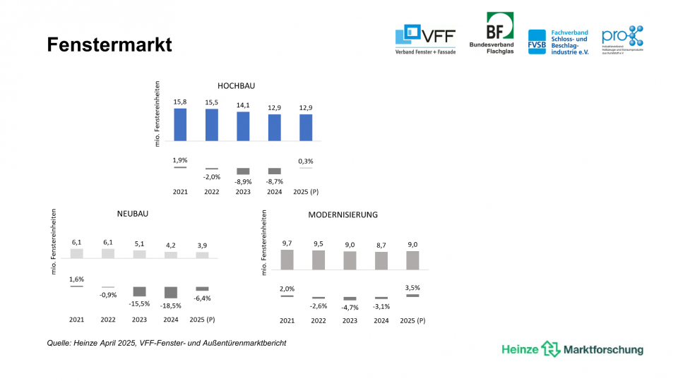 Im Rahmen der Fachtagung Statistik und Markt des Verbandes Fenster + Fassade (VFF) und des Bundesverbandes Flachglas (BF) in Frankfurt stellte Jörg Flasdieck von der Heinze Marktforschung GmbH am 29. April 2025 die abschließenden Zahlen für 2024 sowie die angepassten Prognosen für den Fenster- und Außentürenmarkt 2025 vor. Die Datenerhebung erfolgte im Auftrag der Branchenverbände VFF, BF, pro-K und FVSB in Zusammenarbeit mit der Heinze Marktforschung GmbH.