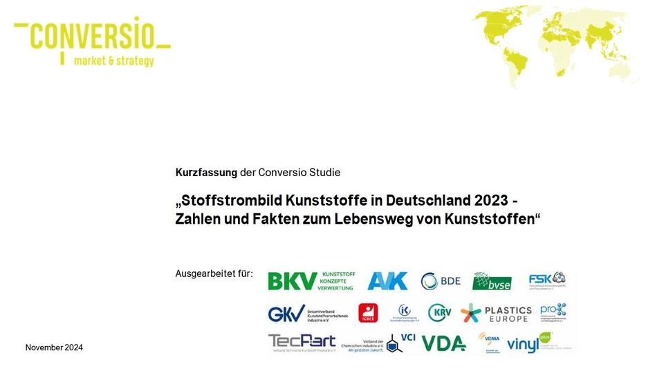 Die Studie „Stoffstrombild Kunststoffe in Deutschland 2023: Zahlen und Fakten zum Lebensweg von Kunststoffen“ liefert alle zwei Jahre umfassende Daten zur Kreislaufwirtschaft von Kunststoffen aus den Bereichen Erzeugung, Verarbeitung, Verbrauch und Verwertung von Kunststoff sowie den Rezyklateinsatz in Deutschland.